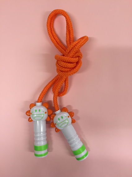 このなわとびを使って、スポーツ教室(課内)で指導を受け、なわとびが跳べるようみんなで一生懸命練習します。なわとびを外遊びの時間に練習している子ども達もいますよ。きれいなオレンジの縄とロゴマークをかたどったふらわーくんふらわーちゃんの持ち手が仲良く並んで、とてもかわいいなわとびに仕上がりました。