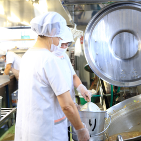 給食は専属の栄養士が献立し、調理師が園専用の給食室で作っているため、毎日出来たてのあたたかい給食です。