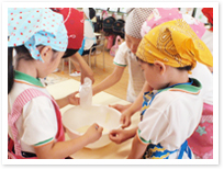 体験学習の様子各教輸が必要と考える子どもの発育発達に合わせた題材を基に、月ごとにテーマを変えながら実施しています。