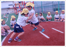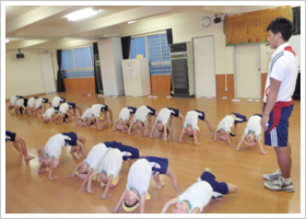 特に幼児期に発達させる必要のある神経系に刺激を与える運動プログラムを中心としたスポーツ教室を行っています。器械体操、サッカー、なわとび、ドッジボールなど様々なスポーツを体験させ、"走・跳・投"の基本的技能を高めます。熱心な指導者のもとで鍛えられた子どもたちは、卒園するときには全国平均値を上回るレベルに成長しています。