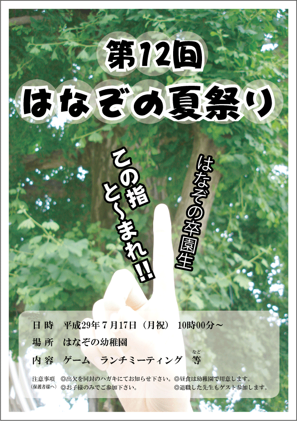 今年もはなぞの幼稚園卒園生 1~3年生を対象に「はなぞの夏祭り~OB・OG会~」を開催します。
