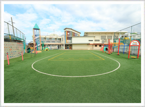 園庭に広がるハイブリッドターフ(人工芝)時には裸足で駆け回り、お天気のいい日はゴロゴロと寝転がる、ドッチボールコートやけんけんぱのラインも書かれている広々とした運動遊びスペースです。