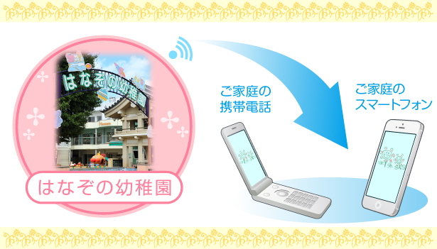 お子さんの園での毎日の活動を携帯メールを使ってクラス単位でお知らせするシステム(はなぞのe-つうしん)を専門業者と共同開発し導入しています。